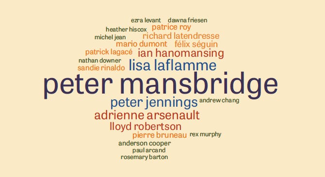 This matters because when you listen to Peter Mansbridge, you’re still listening to someone you associate with the CBC. And someone who rightly draws from that notoriety and trust.